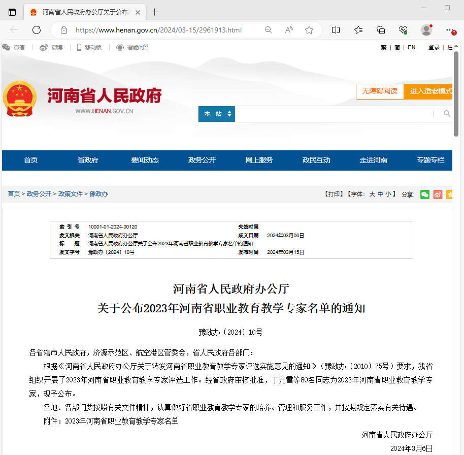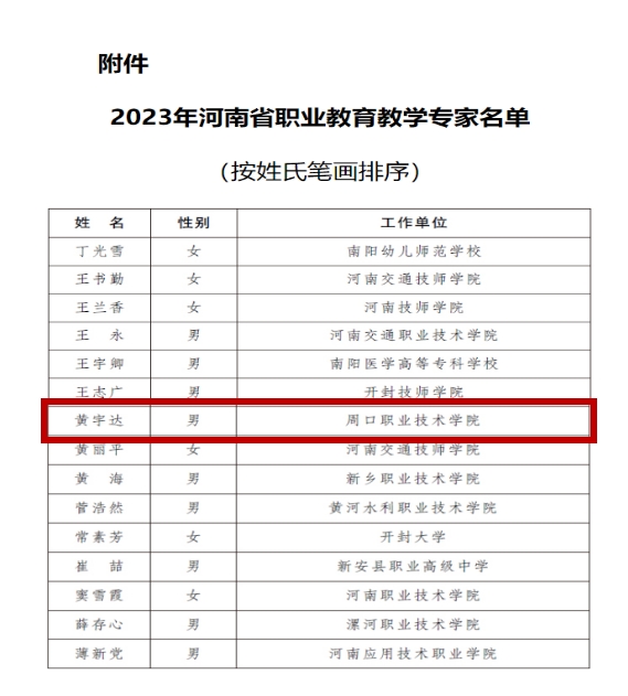 近日,河南省人民政府办公厅印发《关于公布2023年河南省职业教育教学专家名单的通知》(豫政办〔2024〕10号),经省政府审核批准,我院黄宇达院长获评2023年河南省职业教育教学专家。