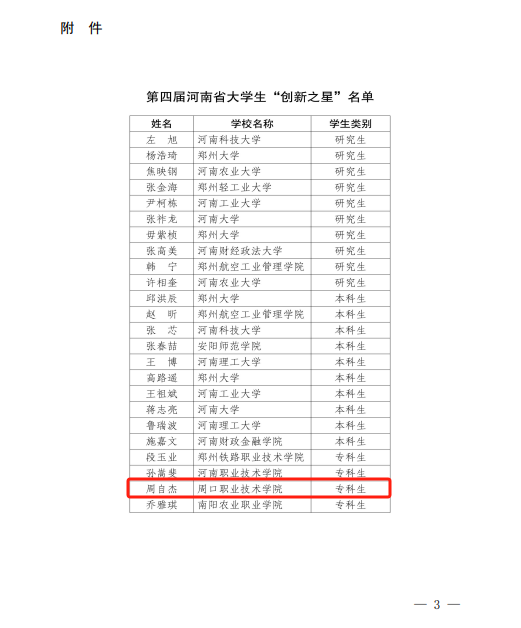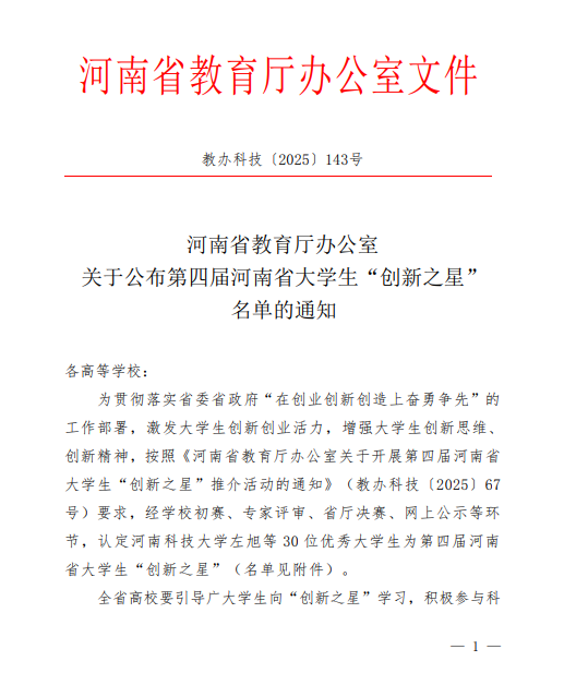 近日,由省教育厅组织开展的第四届河南省大学生“创新之星”评选结果公布。经学校推荐、专家评审、现场决赛等环节,我院2023级计算机网络技术专业三班学生周自杰获第四届河南省大学生“创新之星”荣誉称号,全省高职院校仅10名大学生入选,这也是我院连续两年获此荣誉,充分彰显了学院创新创业人才培养水平和教育教学成果。