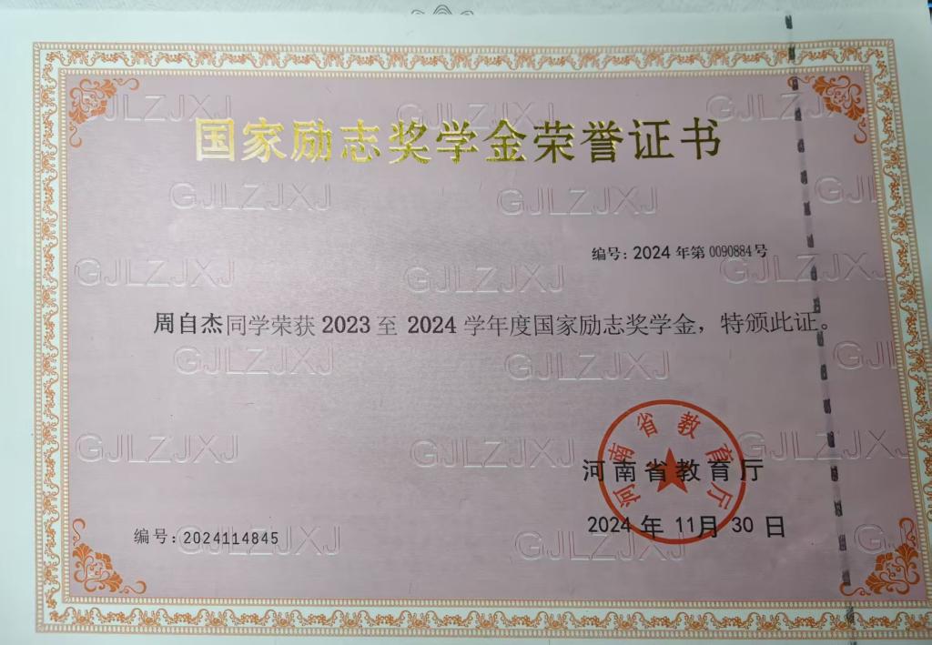 三代从军的家庭氛围,让周自杰自幼怀揣军营梦。他连续3年报名参军,历经近视、超重等挫折后,通过手术、健身等努力,终于在2021年圆梦军营。在部队炊事班岗位上,他凭借坚持拿下炊事比武第一,年夜饭获领导肯定,领悟到平凡岗位亦能创造不凡。退役复学后,面对学业断层困境,周自杰制定分阶段学习计划,坚持365天打卡学习,实现学业逆袭,综合成绩连续两年稳居班级第一,斩获国家励志奖学金并获评“三好学生”。