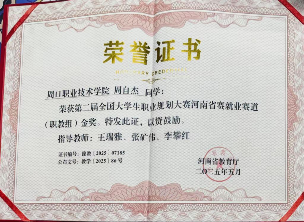 竞赛赛场上,周自杰带领团队啃教材、析案例、勤复盘,从专业“小白”蜕变为科创能手。其团队研发的“智能消防头盔”获5项实用新型专利,还斩获中国国际大学生创新大赛铜奖、一带一路暨金砖国家技能赛事国赛一等奖等荣誉,相关事迹获20余次媒体报道。