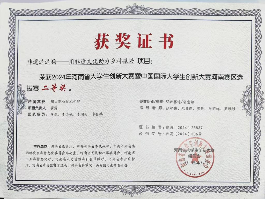 竞赛赛场是李想“蓄力”发力的舞台。她带领团队攻坚克难,累计斩获30余项竞赛奖项,涵盖国际赛一等奖1项、国赛三等奖2项、省赛一等奖8项等;还以第一申请人身份申请1项自主知识产权,团队共申请3项,其事迹被周口电视台、学习强国等媒体报道。在“实践”层面,李想聚焦淮阳泥泥狗非遗传承困境,带领团队走访传承人学习捏制技艺,依托专业知识搭建数字档案资源库,制作的非遗宣传纪录片在主流平台收获百万级浏览量,还推动该非遗文化与孟加拉等国开展跨文化交流。
